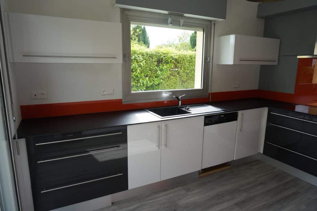 Cuisine en Pianovo blanc brillant et gris cosmo, plan de travail compact, crédence en verre, poignées bâton.